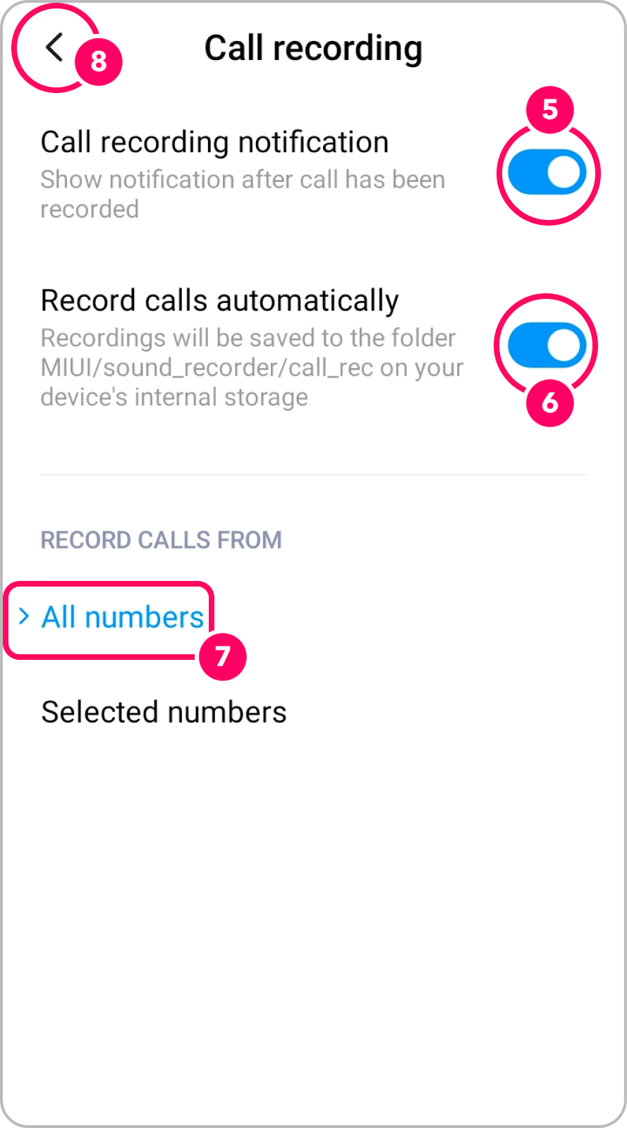 Turn on 'Record calls automatically'. Ensure you have selected 'All numbers' and click on the back button.